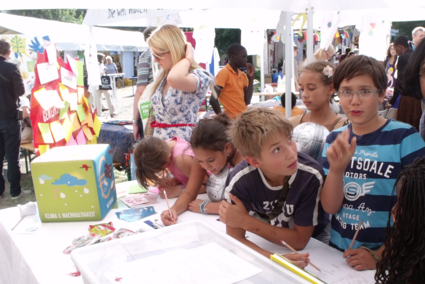 Bei angenehm sommerlichen Temperaturen genossen am gestrigen Sonntag viele Besucher/-innen ihre freie Zeit beim Tag der offenen Tür im Berliner Regierungsviertel. Auch das Bundesministerium für wirtschaftliche Zusammenarbeit und Entwicklung lud interessierte Bürgerinnen und Bürger zum Austausch mit Vertreter/-innen aus über 40 Kooperationsländern und zahlreichen Nichtregierungsorganisationen auf sein Gelände ein. Schulen – GEMEINSAM FÜR AFRIKA präsentierte sich auf dem Fest mit einem umfangreichen Angebot für Jung und Alt: Mit viel Interesse und Neugier blätterten die Besucher/-innen in unseren Unterrichtsmaterialien, puzzelten oder testeten mit Begeisterung ihr Wissen zu Afrika – mit so manchem Aha-Erlebnis! „Afrika – da denke ich an…“ lautete in diesem Jahr zudem unsere Umfrage, über die sich sowohl Kinder als auch Erwachsene Gedanken machten und diesen auf unserem großen Afrika-Kontinent Ausdruck verliehen. Für unsere große Sommertour mit der Initiative „Zukunftsentwickler“ des BMZ war der Tag der offenen Tür die vorerst letzte Station auf der Reise durch die Republik. Mit einem vielfältigen Bühnenprogramm, diversen Mitmachaktionen und allerhand Informationen rund um die Entwicklungszusammenarbeit wurde der Abschluss daher gebührend gefeiert. Auf flickr.com finden Sie Bilder zum Auftritt der Schulkampagne beim Tag der offenen Tür im BMZ.