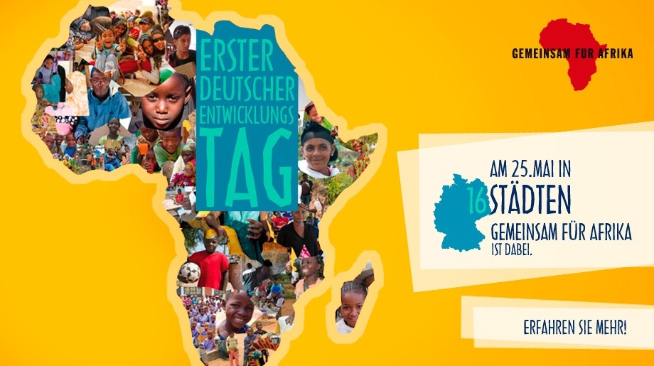 Mit dem Kontinent der Potentiale waren wir bei den Veranstaltungen in 16 Städten zum Ersten Deutschen Entwicklungstag am 25. Mai 2013 dabei : In 16 Städten wartete ein fünf Meter hoher Afrika-Kontinent auf die Besucher/-innen. Auf diesem stellten wir die Projektarbeit der Organisationen von GEMEINSAM FÜR AFRIKA vor. An unserem Aktionsstand boten wir einen Blick hinter die Kulissen der Projekte und Infos aus erster Hand von den Vertreter/-innen unserer Organisationen. In einer Bastelecke konnten die großen und kleinen Besucher/-innen eigene Beiträge kreieren, die sie dann mit einem Scherenwagen an unserem großen Afrikakontinent befestigen konnten. Impressionen dazu finden Sie hier.