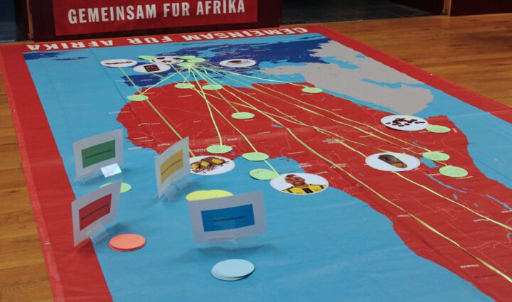 Lernkoffer: Vernetzungsspiel Afrika-Europa Shop· Grundschule·Lernkoffer·Sekundarstufe I und II·Unsere Afrika-Spiele, Poster und Flyer Informationen zur Ausleihe Kosten: kostenfrei Transportkosten: wir übernehmen das Porto Minimale Ausleihdauer: 5 Tage Maximale Ausleihdauer: 14 Tage Spätestens zurückschicken nach: 44 Days Wissen Sie wo der Kakao für Ihre Schokolade herkommt? Oder die Bestandteile Ihres Handys? Gehen Sie mit dem Vernetzungsspiel auf Spurensuche. Ausleihzeitraum Gesamt: € () Lernkoffer: Vernetzungsspiel Afrika-Europa Menge Zum Bestellen anmelden Artikelnummer: 1003 Kategorien: Grundschule, Lernkoffer, Sekundarstufe I und II, Unsere Afrika-Spiele, Poster und Flyer Beschreibung Informationen zur Kofferleihe Wie leihe ich einen Koffer aus? Beschreibung Finden Sie heraus, wie eng Ihre Lebenswelt mit der des afrikanischen Kontinents verbunden ist. Vielen Menschen in Deutschland ist nicht bewusst, wie eng ihre Lebenswelt mit der vieler afrikanischer Länder verbunden ist. Das Vernetzungsspiel veranschaulicht diese Verbindung auf spielerische Art und Weise. Das Spiel wird auf einer großen Plane von 6 mal 3 Metern gespielt, also ideal für den Einsatz auf Messen, Großveranstaltungen, „Afrika-Events“ und im Bereich entwicklungspolitischer Bildung. Ziel ist es, so viele Verbindungen zu Afrika wie möglich herzustellen. Das Vernetzungsspiel Afrika-Europa eignet sich auch wunderbar als Einstieg für einen Projekttag oder eine Projektwoche, weil es Schüler*innen zeigt, wie eng ihre Lebenswelt mit dem afrikanischen Kontinent vernetzt ist. Gehen Sie mit unserem Vernetzungsspiel auf Spurensuche zwischen Afrika und Europa! Sie können das Vernetzungsspiel kostenlos für zwei Wochen ausleihen. Danach müssen Sie das Spiel an GEMEINSAM FÜR AFRIKA zurückschicken. Hier können Sie sich den Leitfaden (PDF) des Vernetzungsspiels anschauen, bevor Sie es für Ihren Unterricht bestellen. Bestellen geht ganz einfach, indem Sie unten auf „Kostenlos bestellen“ klicken. Lesen Sie hier einen ersten Erfahrungsbericht vom KENAKO-Festival 2018, bei dem am Ende mehr als 600 Vernetzer*innen beherzt zu Stift und Zettel griffen, um ihre persönlichen Verbindungen auf die Plane einzutragen – die Vernetzungs-Plane als Publikumsmagnet. Informationen zur KofferleiheDie Koffer bzw. die Spiele werden nur innerhalb Deutschlands versendet. Die Koffer bzw. Spiele können nur an Schulen oder Lehrinstitutionen versendet werden. Die Pakete werden ca. eine Woche vor Ihrem Wunschtermin mit DHL verschickt. Wir übernehmen einmalig alle Portokosten! Wie leihe ich einen Koffer aus?Die Lernkoffer bzw. Spiele können kostenfrei für zwei Wochen von Schulen oder anderen pädagogischen Einrichtungen ausgeliehen werden. Zeitraum auswählen. Rechts finden Sie einen Kalender, der die Verfügbarkeit des Lernkoffers anzeigt. Wählen Sie hier den Zeitraum, in dem Sie den Koffer haben möchten. Info: Wir werden den Koffer ca. eine Woche vor Ihrem Wunschtermin mit DHL verschicken. Bestellformular ausfüllen. Wir verschicken den Lernkoffer nur an offizielle Einrichtungen. Falls Sie den Koffer an Ihre Privat-Adresse geschickt haben möchten (z. B. wegen Schließzeiten der Schule), vermerken Sie dies bitte ganz unten im Kommentar. Bestellung abschicken. Sie bekommen eine Bestätigung per E-Mail. Zusätzlich können Sie den Status des Lernkoffers unter Ihrem Konto und "Meine Bestellungen" einsehen. Der Koffer wird verschickt. Wenn wir den Koffer losschicken, bekommen Sie nochmal eine E-Mail mit einer DHL-Tracking-Nummer. Den Lernkoffer einsetzen. Freuen Sie sich mit Ihren Schüler*innen an den Materialien des Lernkoffers. Zurücksenden. Im Koffer finden Sie einen Umschlag mit einer Checkliste (bitte stellen Sie sicher, dass Sie alle Gegenstände und CDs/DVDs wieder einpacken) und einen DHL-Retoureschein. Bringen Sie diesen außen an das Paket an und liefern Sie ihn im nächsten DHL-Shop ein. Bitte lassen Sie sich einen Beleg geben (falls das Paket verloren geht). Abschluss. Ist der Koffer vollständig bei uns angekommen, ändert sich auch der Status in Ihrem Konto.