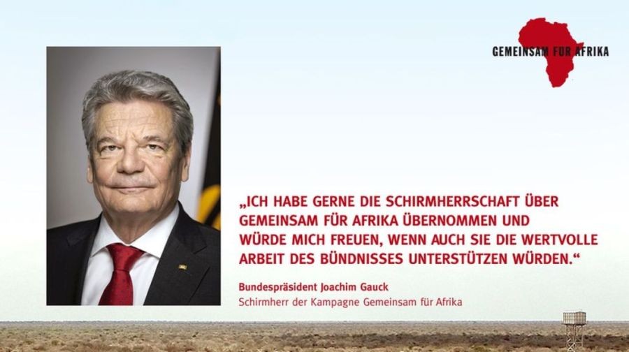 Bundespräsident Joachim Gauck über GEMEINSAM FÜR AFRIKA: „Jeder ist seines Glückes Schmied, aber wann und wo wir auf diese Welt kommen wird auf einem anderen Amboss entschieden. Geburtsort und Geburtszeit haben aber sehr viel damit zu tun, welche Chancen Menschen im Leben haben. Stellen Sie sich nur einmal vor, wie es ist, in einen Bürgerkrieg in Afrika geboren zu werden. GEMEINSAM FÜR AFRIKA setzt sich dafür ein, dass Menschen in Afrika ihre Potenziale voll nutzen können. Das Bündnis von Hilfsorganisationen verbessert zusammen mit seinen Partnern in Afrika in tausenden Projekten die Lebensbedingungen der Menschen. In Deutschland fördert und fordert GEMEINSAM FÜR AFRIKA neue Blickwinkel und differenzierte Sichtweisen auf unseren Nachbarkontinent. Das Schicksal von Afrika wird auch in Europa mitbestimmt. Damit trägt GEMEINSAM FÜR AFRIKA zu mehr Chancengleichheit und besseren Entwicklungsperspektiven bei. Ich habe daher gerne die Schirmherrschaft über GEMEINSAM FÜR AFRIKA übernommen und würde mich freuen, wenn auch Sie die wertvolle Arbeit des Bündnisses unterstützen würden.“ (Bundespräsident Joachim Gauck, Schirmherr der Kampagne GEMEINSAM FÜR AFRIKA)
